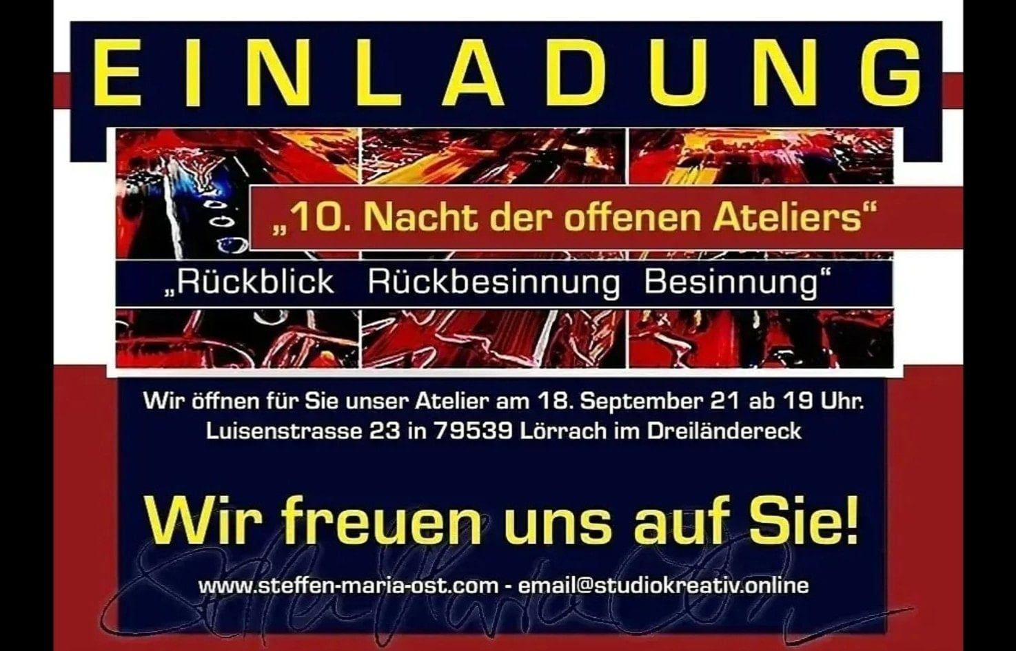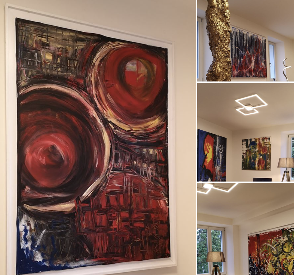 Voici un petit retour sur les années 2020 à 2023 à la Galerie Ost (Luisenstraße 23 à 79539 Lörrach), que nous avions également louée par écrit comme objet commercial selon notre contrat de location dans ce studio, la Galerie Ost avec un studio photo pour la créativité en studio qui a été élargie pour nos besoins. & avec nos propres énergies, nous l'avons magnifiquement agrandi à plus de 500 mètres carrés, qui ont été unanimement déclarés par les visiteurs de la « nuit des studios ouverts » comme les plus belles salles destinées à présenter l'art à Lörrach dans le triangle frontalier, mais malheureusement, Cela s'est finalement avéré complètement contraire à nos attentes après Corona et En raison d'autres divergences et des tâches de la propriété, celles-ci n'ont pas été achevées à ce moment-là, même si nous avions fait preuve de suffisamment de patience pendant les trois années entières.