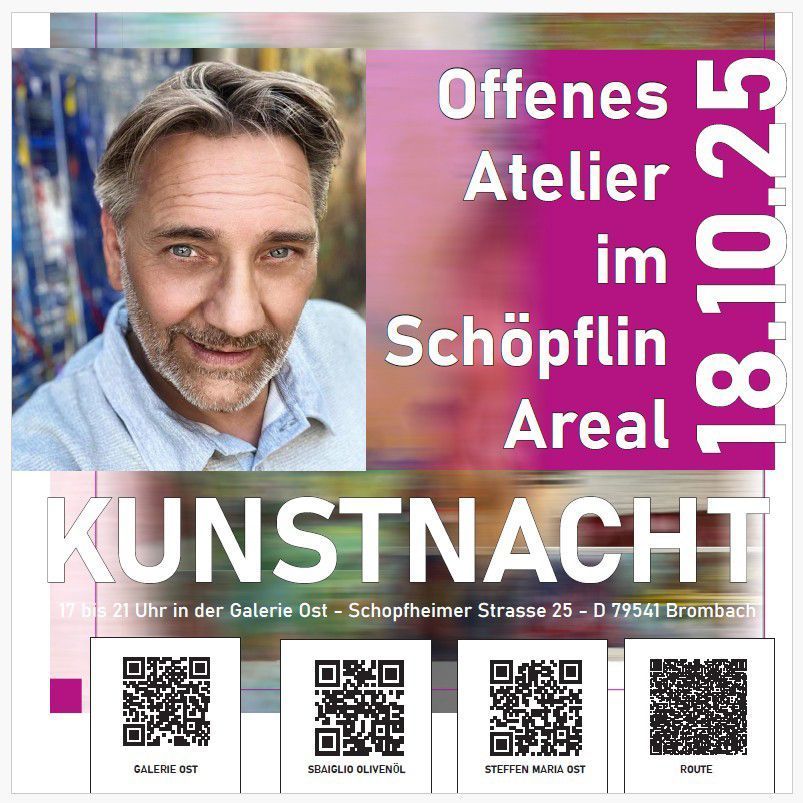 Liebe Freundinnen und Freunde der Kunst, ich freue mich sehr, Sie herzlich zu meiner „Langen Nacht des offenen Ateliers“ am Samstag, den 18. Oktober 2025, ab 17 Uhr einzuladen. An diesem Abend öffne ich mein Atelier für alle Kunstinteressierten, Freundinnen und Freunde – zum Entdecken, Austauschen, Staunen und Genießen. Lassen Sie sich von neuen Arbeiten inspirieren, werfen Sie einen Blick hinter die Kulissen meines Schaffens und verbringen Sie mit mir einen stimmungsvollen Abend in kreativer Atmosphäre. Für kleine Erfrischungen ist gesorgt, und ich freue mich auf viele gute Gespräche, Begegnungen und gemeinsame Momente voller Kunst und Inspiration. Bitte beachten Sie: Nach 19 Uhr ist die Einfahrtsschranke zum Schöpflin Areal automatisch geschlossen. Ab diesem Zeitpunkt erreichen Sie das Atelier nur zu Fuß, ausser das Tor wird durch herausfahrende Fahrzeuge automatisch geöffnet. Der Weg ist wie immer mit pinken Tafeln gut ausgeschildert. Ich freue mich auf Ihr Kommen! Mit herzlichen Grüßen Ihr Steffen Maria Ost
