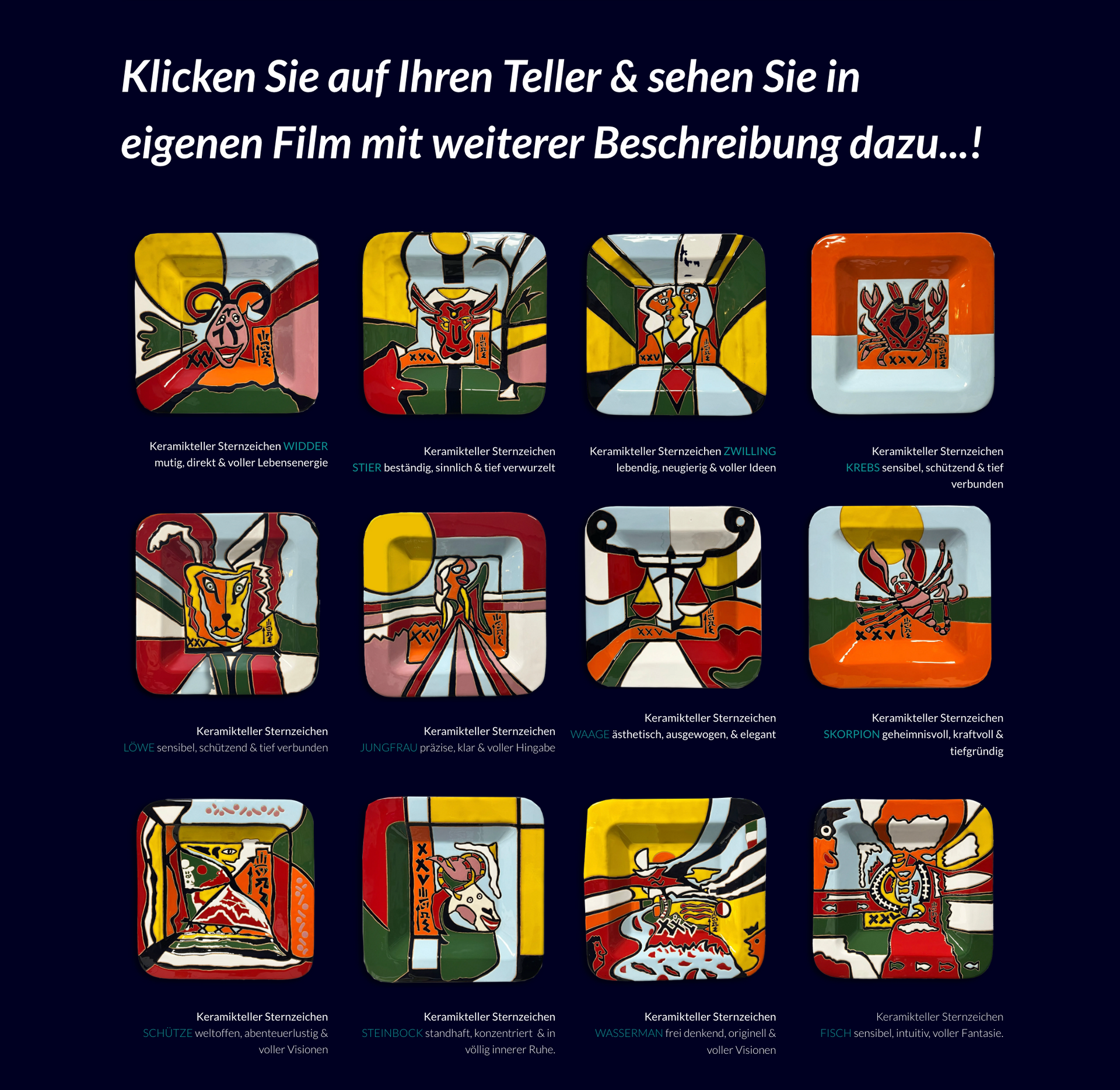 Liebe Freundin, lieber Freund meiner Kunst, mit den KUNSTKERAMIKTELLERN STERNZEICHEN habe ich mir einen lang gehegten Gedanken erfüllt – diese zwölf Zeichen des Tierkreises für Sie künstlerisch auf Keramik zu bannen. Ich habe es wahrlich für Sie getan, und ich bin der Meinung: Sie sind alle sehr schön geworden – jedes mit seinem eigenen, besonderen Ausdruck. Vielleicht fragen Sie sich nun: Wie und wo kann man sie im Original sehen? Leuchten sie tatsächlich so intensiv wie auf den Fotos und in den Filmen? Ich kann Ihnen das mit einem klaren Ja beantworten! Und dennoch – wenn Sie die Werke persönlich erleben möchten, sind Sie herzlich eingeladen, mich zu besuchen. Bitte beachten Sie dazu meine neuen Besuchszeiten, die ab dem 1. Oktober 2025 gelten. Vom 1. bis 3. Oktober sowie am 18. Oktober 2025 lade ich Sie herzlich zur „Nacht des offenen Ateliers“ in meine Galerie Ost in Brombach ein. Dort hängen alle zwölf Sternzeichen vereint auf einer Wand – leuchtend, kraftvoll, lebendig. Darüber hinaus können Sie meine Werke bis zum 30. November 2025 täglich von 11 bis 18 Uhr in meiner Galerie im Original erleben – und vielleicht den STIER in einem ganz neuen Licht entdecken → Vereinbaren Sie hierzu gerne Ihren persönlichen Termin mit mir. Im Dezember 2025 bin ich in Mailand zu meiner Ausstellung in der Galleria Cael. Anschließend arbeite ich wieder in meinem Sommeratelier in der Toskana und bin voraussichtlich im Februar 2026 zurück. Wenn Sie sich oder Ihren Lieben zu Weihnachten einen Kunstkeramikteller von mir schenken möchten, empfehle ich eine Bestellung bis spätestens Ende November. Da jedes Werk ein Einzelstück ist und neue Teller in dieser speziellen Technik rund einen Monat Produktionszeit benötigen, kann sich die Lieferzeit sonst entsprechend verlängern. Ich freue mich auf Ihren Besuch – und darauf, Ihnen alle Kunstkeramikteller persönlich zu zeigen. Lassen Sie sich treiben. Lassen Sie sich inspirieren. Herzlich, Ihr Steffen Maria Ost PS: Wenn Sie Ihren persönlichen Kunstkeramikteller gleich bestellen möchten, sichern Sie sich jetzt Ihr Unikat.